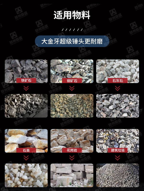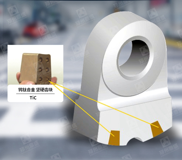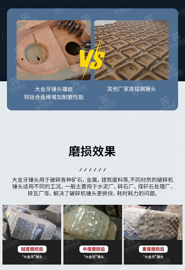 采用爐外精煉,鋼水更純凈,錘頭整體采用壓力鑄造,組織更致密。錘頭本體如同鑲牙一般鑲鑄極其堅(jiān)硬的鎢鈦合金齒塊,尤其適合高硅、堅(jiān)硬、耐磨蝕性石灰石。