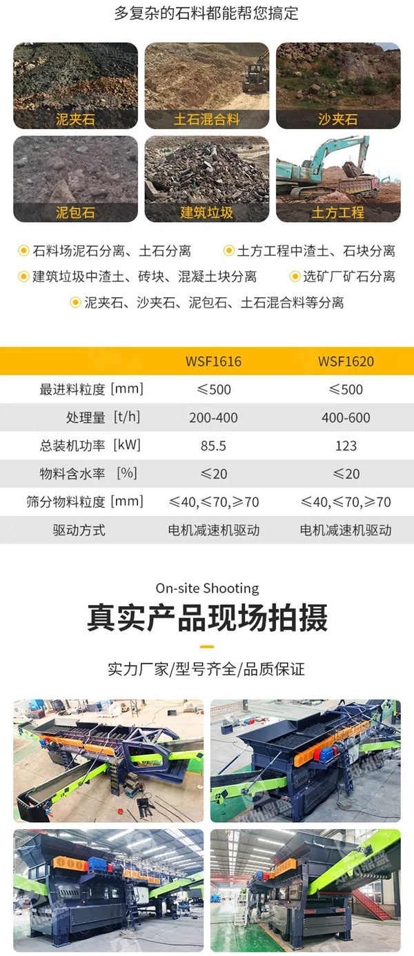 如果選用傳統(tǒng)的振動篩和螺旋洗礦機作為泥石分離機可以嗎?有些可以,有些根本無法做到。振動篩可以篩分粒度相差不大的泥土和碎石,對于大塊石頭和泥土分離難以做到,而且對于粘性高的泥土石頭分離幾乎不可能做到;螺旋洗礦機可以分離一定粘性的泥土和石頭,但是需要大量的水,對于許多缺水的礦山來說,又是一個非常頭疼的問題,甚至無水的時候,項目必須擱淺,無法開發(fā)。