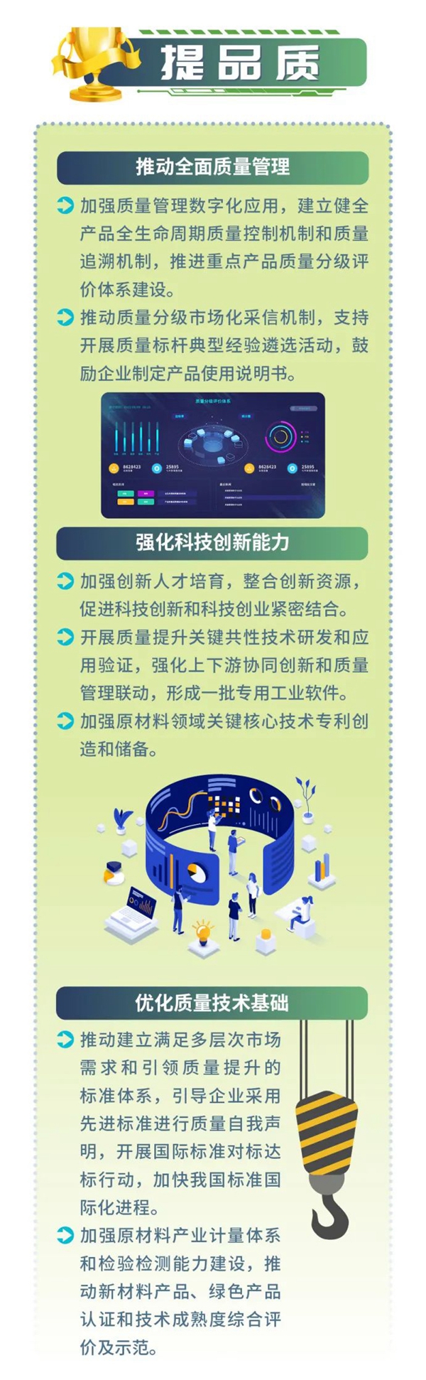 提品質(zhì)——推進建材等行業(yè)產(chǎn)品質(zhì)量分級評價體系建設,推動建立質(zhì)量分級、應用分類的市場化采信機制。