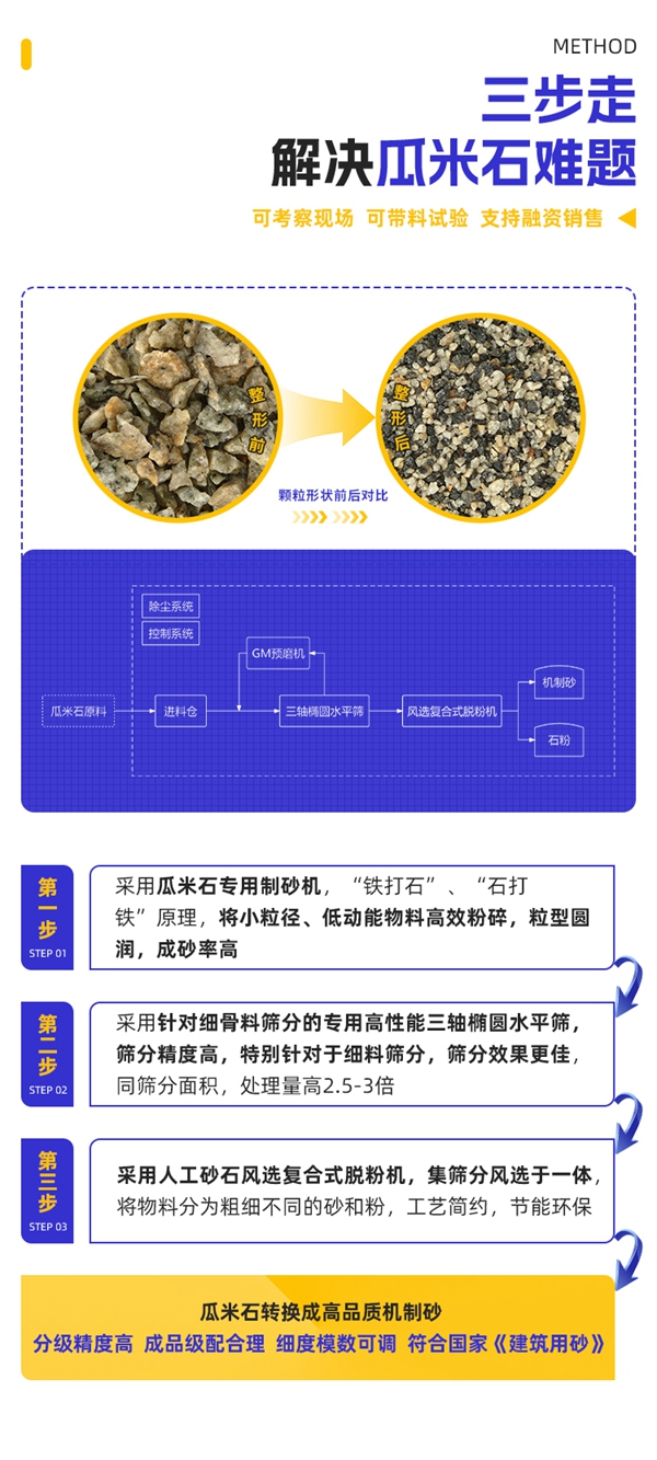 根據(jù)瓜米石顆粒粒度小,再處置破碎困難,進料要求高3-5MM(僅作為補充料來使用),如果進5-10MM的制砂率50%,針片狀多,級配不合理,建筑用料不達標(biāo),對輥制砂機投資高80-100萬。