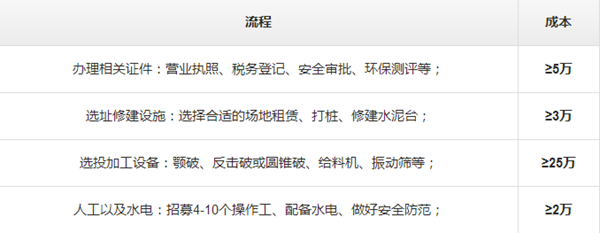 以上是從市場統(tǒng)計數(shù)據(jù)分析得來的開辦石料廠流程與需要的成本,總計約需要35萬以上的投資成本,不同的規(guī)模、產(chǎn)量需求決定了不同的成本,如果您想獲取更詳細的專屬石子加工廠每噸成本、方案分析,可點擊在線咨詢 ,由廠家專業(yè)人員在線為您解答。
