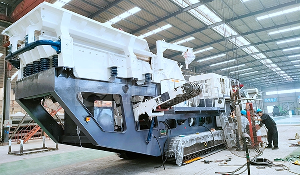 移動(dòng)破碎機(jī)工作原理:大塊物料經(jīng)過(guò)給料機(jī)均勻輸送到移動(dòng)破碎站設(shè)備內(nèi),由顎式破碎機(jī)初次加工,物料再經(jīng)輸送機(jī)送入反擊式破碎機(jī)進(jìn)行二次處理,破碎出的物料經(jīng)振動(dòng)篩進(jìn)行篩分,滿足破碎要求的物料由輸送機(jī)輸出,不滿足要求的物料再次進(jìn)入反擊式破碎機(jī)破碎,通過(guò)圓振動(dòng)篩構(gòu)成閉路系統(tǒng),實(shí)現(xiàn)物料的循環(huán)破碎,成品物料由輸送機(jī)輸出,進(jìn)行連續(xù)破碎作業(yè)。