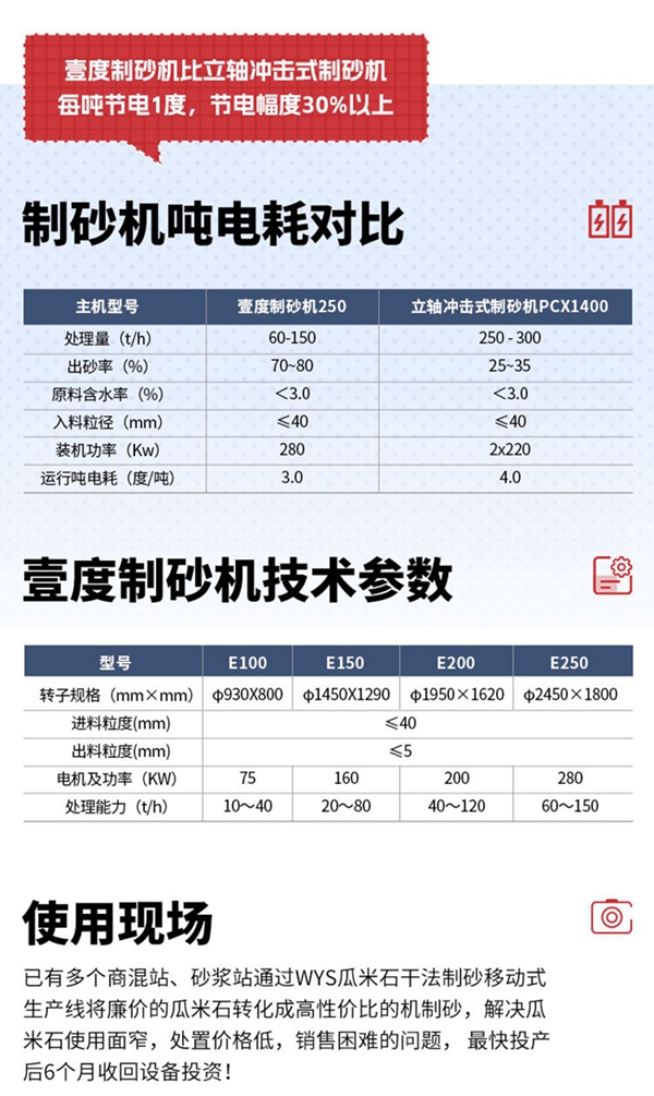瓜米石制砂專用制砂機(壹度制砂機)與市面上傳統(tǒng)的沖擊式制砂機的區(qū)別主要是成砂率、顆粒級配、含粉量以及用電量。