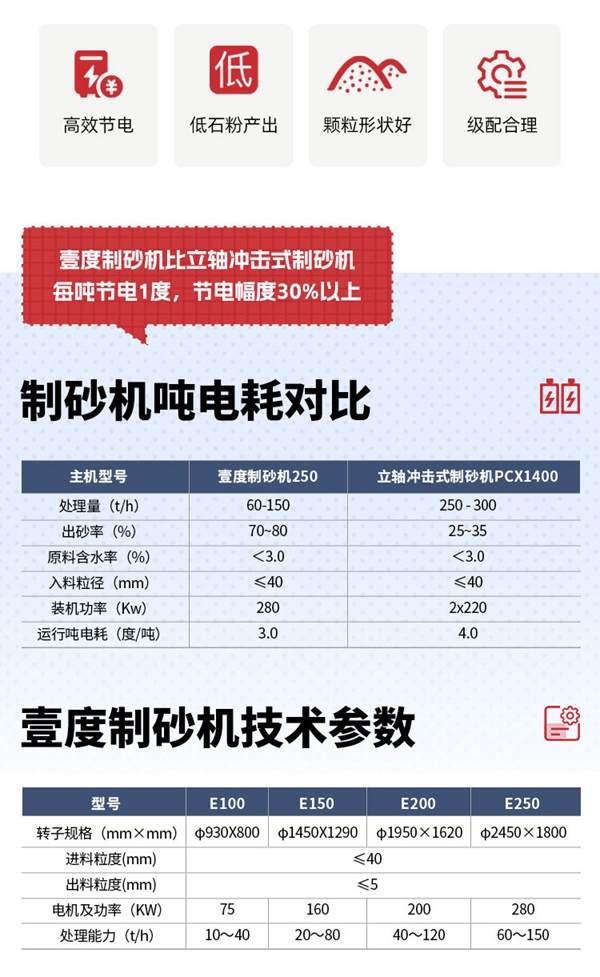 壹度制砂機與“石打石”沖擊式制砂機相比,節(jié)電可達30%,且出砂成品質量優(yōu)良,符合國標二區(qū)標準。