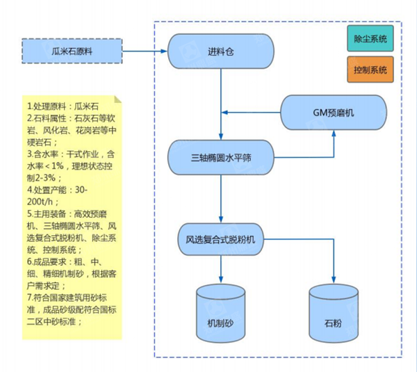 瓜米石俗稱為石沫,顆粒大小與綠豆相似,是一種碎石料,又稱為石粉、豆石,因品相與瓜子片相像,顆粒小而又常見于針片狀存在,所以限制了其的使用領(lǐng)域,給骨料銷售帶來(lái)困難,時(shí)常于低價(jià)格或者廢棄料處置。為幫助客戶解決瓜米石使用面窄,處置價(jià)格低,銷售困難的問題,鼎盛公司抓住客戶困境重視客戶體驗(yàn),并根據(jù)瓜米石顆粒粒度小,再處置破碎困難,處置成本高,細(xì)篩分困難等的特性,且在干法作業(yè)與濕法作業(yè)的選擇中,選擇干法脫粉保證生產(chǎn)工況,通過一系列設(shè)備改良,工藝優(yōu)化組合,推出瓜米石專用干法制砂系統(tǒng),逐步解決上述問題,將低價(jià)格的廢棄瓜米石,一舉成功轉(zhuǎn)化成高性價(jià)比的人工機(jī)制砂。