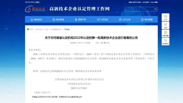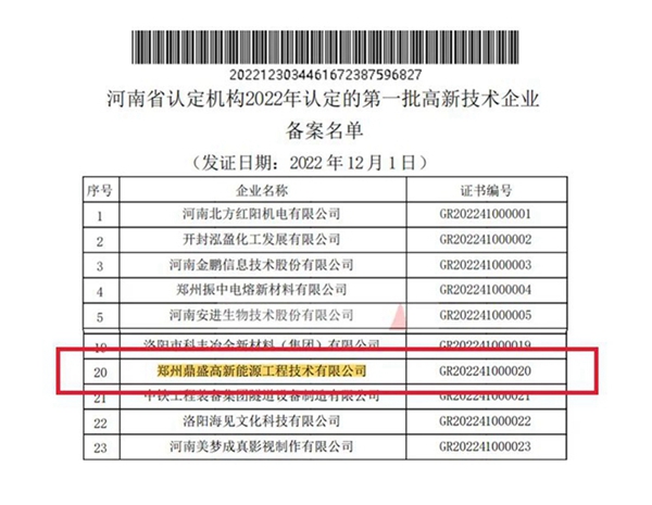 2022年12月30日,全國(guó)高新技術(shù)企業(yè)認(rèn)定管理工作領(lǐng)導(dǎo)小組辦公室,公布了《河南省認(rèn)定機(jī)構(gòu)2022年認(rèn)定的第一批高新技術(shù)企業(yè)備案公告名單》。鄭州鼎盛高新能源工程技術(shù)有限公司(以下簡(jiǎn)稱“鄭州鼎盛”)名列其中,順利通過(guò)“國(guó)家高新技術(shù)企業(yè)”復(fù)審認(rèn)定。