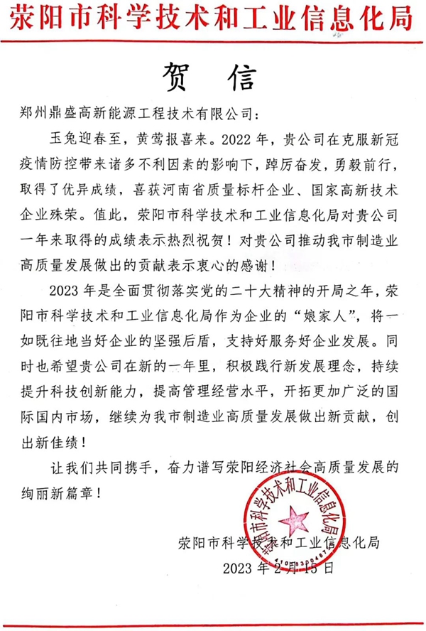 2月15日,滎陽市科學(xué)技術(shù)和工業(yè)信息化局向鄭州鼎盛高新能源工程技術(shù)有限公司(以下簡稱“鄭州鼎盛”)發(fā)來賀信。向公司過去一年取得優(yōu)異成績表示祝賀,恭賀鄭州鼎盛喜獲河南省質(zhì)量標桿企業(yè)、國家高新技術(shù)企業(yè)等殊榮。對鄭州鼎盛推動滎陽市制造業(yè)高質(zhì)量發(fā)展做出的貢獻表示感謝。