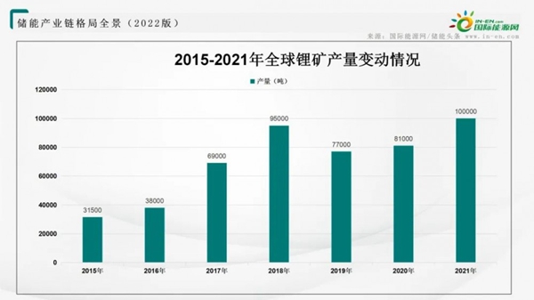 從供應量上看,2021年全球鋰礦石產量約為10萬噸(不包括美國),較2020年的8.25萬噸增長21%。2021年全球鋰資源消費量估計為9.3萬噸,較2020年的7萬噸增長33%。