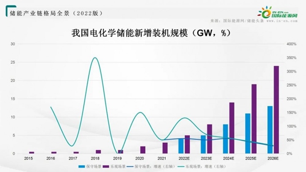 根據(jù)國家發(fā)展改革委、國家能源局發(fā)布的《關于加快推動新型儲能發(fā)展的指導意見》規(guī)劃,2025年我國將實現(xiàn)新型儲能裝機規(guī)模 30GW 以上,據(jù) CNESA 保守估測,2026年我國新型儲能裝機累計規(guī)模將達到48.5GW,對應2022-2026CAGR為 53.5%。