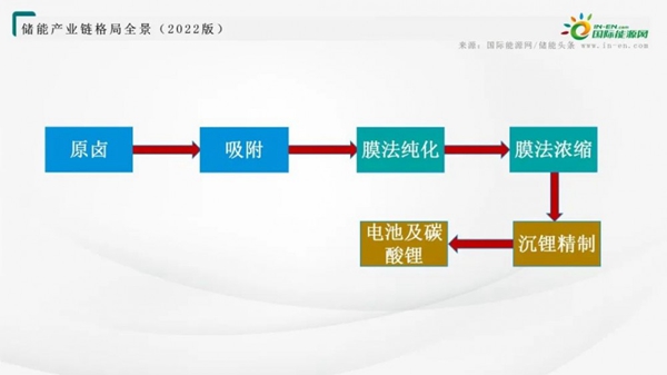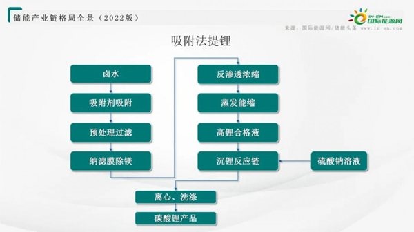 通過對鋰有選擇性的吸附劑吸附鹵水中的鋰,再用淡水解吸與其他雜質分離并富集,再通過小型鹽田濃縮后化學沉淀鋰。