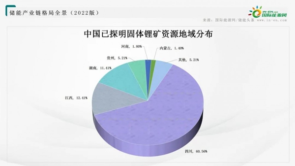 礦石鋰資源分布于四川、江西、湖南、新疆等省份,存儲量約為全國鋰資源存儲量的20%左右,其中四川省的儲量較大,占全國礦石鋰資源儲量的60%左右。