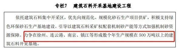 《規(guī)劃》強(qiáng)調(diào)長(zhǎng)江經(jīng)濟(jì)帶、長(zhǎng)三角區(qū)域一體化發(fā)展等國家發(fā)展戰(zhàn)略實(shí)施,新型工業(yè)化、新型城鎮(zhèn)化的推動(dòng)以及大量基礎(chǔ)設(shè)施建設(shè),對(duì)礦產(chǎn)資源的需求仍將維持在高 位。砂石資源供需矛盾突出,要統(tǒng)籌實(shí)施國家戰(zhàn)略性礦產(chǎn)和江蘇重要礦產(chǎn)的勘查開發(fā),保持一定規(guī)模的礦產(chǎn)開采總量,提高礦產(chǎn)資源保障能力,規(guī)?;_采建筑石料,滿足經(jīng)濟(jì)社會(huì)發(fā)展需求。