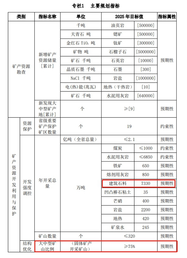 (一)在礦產(chǎn)資源開發(fā)利用與保護(hù)方面,規(guī)劃共劃定13個(gè)重點(diǎn)開采區(qū)、8個(gè)建筑石料集中開采區(qū)和19個(gè)省級(jí)重要礦產(chǎn)保護(hù)礦區(qū)。提出2025年全省開采總量預(yù)期在2.1億噸以內(nèi)、礦山數(shù)預(yù)期在320個(gè)以內(nèi)的開發(fā)強(qiáng)度調(diào)控目標(biāo)。確定10個(gè)主要調(diào)控礦種,其中煤炭、水泥用灰?guī)r等2個(gè)礦種年開采總量定為約束性指標(biāo),鐵礦、熔劑用灰?guī)r、建筑石料、凹凸棒石粘土、巖鹽、芒硝、地?zé)?、礦泉水等8個(gè)礦種年開采總量定為預(yù)期性指標(biāo)。鼓勵(lì)引導(dǎo)礦山規(guī)?;_采,優(yōu)化大中型礦山比例。2025年,全省固體礦產(chǎn)大中型礦山比例預(yù)期在75%以上。