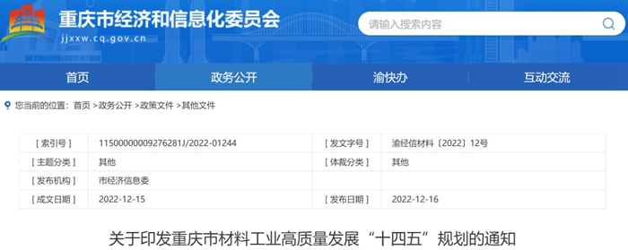 近日,重慶市經信委發(fā)布了《關于印發(fā)重慶市材料工業(yè)高質量發(fā)展“十四五”規(guī)劃的通知》。