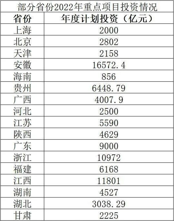 截至目前,全國(guó)已有19個(gè)省市區(qū)公布了2022年重點(diǎn)項(xiàng)目投資計(jì)劃清單,包括北京、上海、天津、廣東、江蘇、浙江、四川、貴州、河北、安徽等。其中,安徽、江西、浙江三省年度計(jì)劃投資均超萬(wàn)億元。